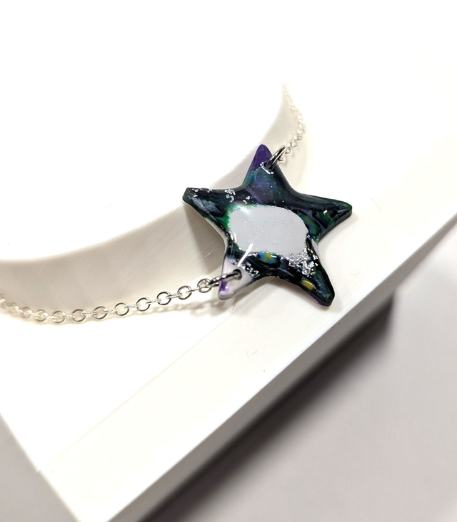 Son motif associe du vert, violet et blanc avec des touches de feuille d'argent, le tout protégé par une couche de résine qui apporte éclat et profondeur.