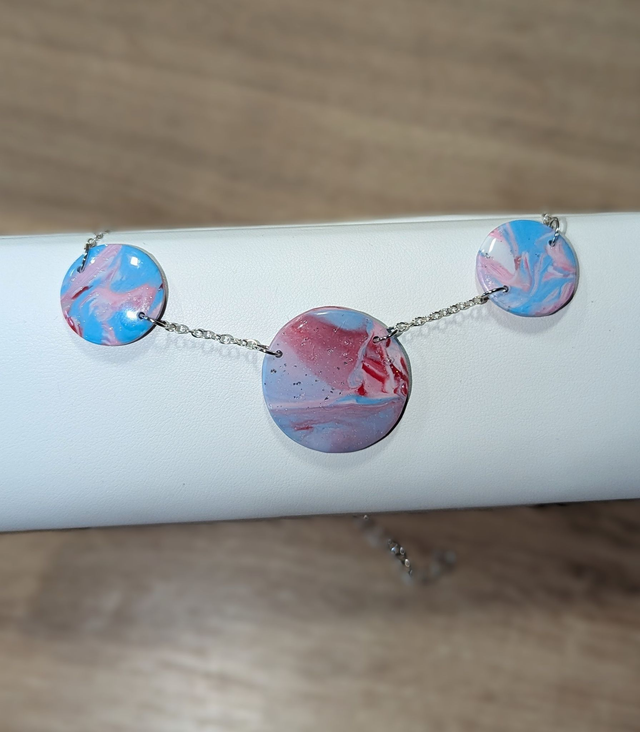Dans les coloris rose, rouge, blanc et bleu avec des touche de feuille d'argent, le tout protégé par une couche de résine qui apporte éclat et profondeur.