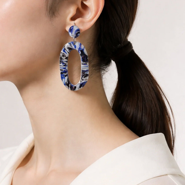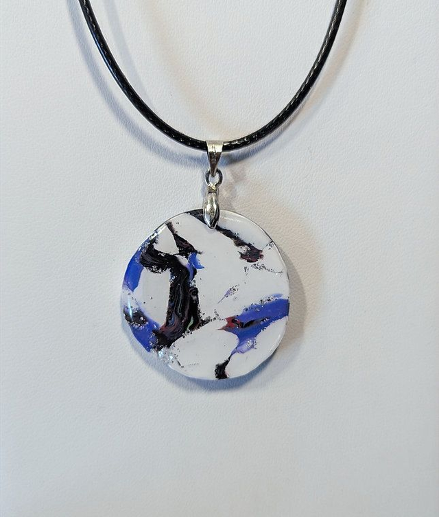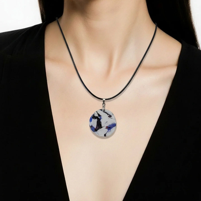 Son motif associe des tons bleus, blanc et noir et une légère note de feuille d'argent, le tout protégé par une couche de résine qui apporte éclat et profondeur.
