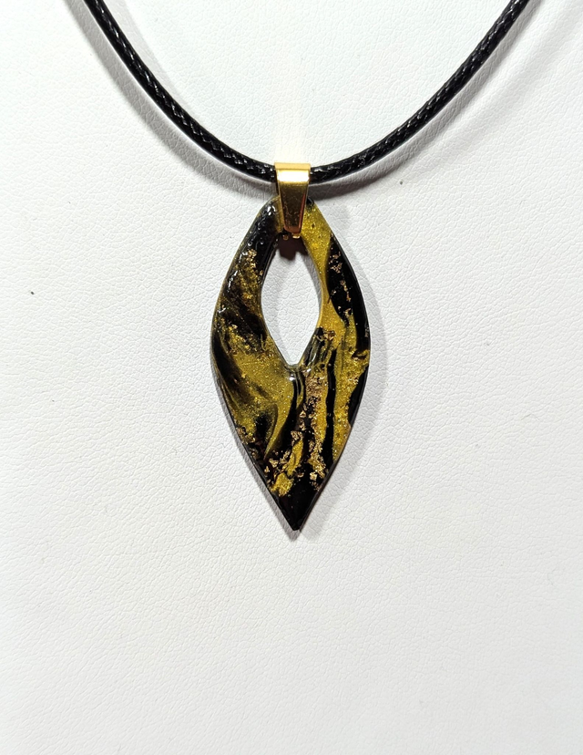 Mélange délicat de noir et doré avec une fine couche de touche de feuille d'or; le tout protégé par une couche de résine qui apporte éclat et profondeur. Il est monté sur un cordon mais possibilité de demander une chaine et de préciser la longueur de chaine souhaitée.