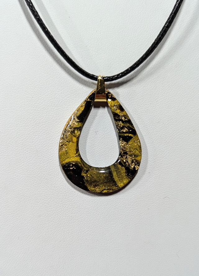 Mélange délicat de noir et doré avec une fine couche de touche de feuille d'or; le tout protégé par une couche de résine qui apporte éclat et profondeur. Il est monté sur un cordon mais possibilité de demander une chaine et de préciser la longueur de chaine souhaitée.
