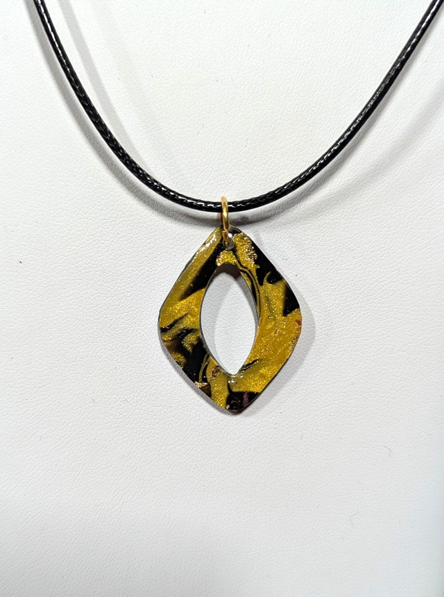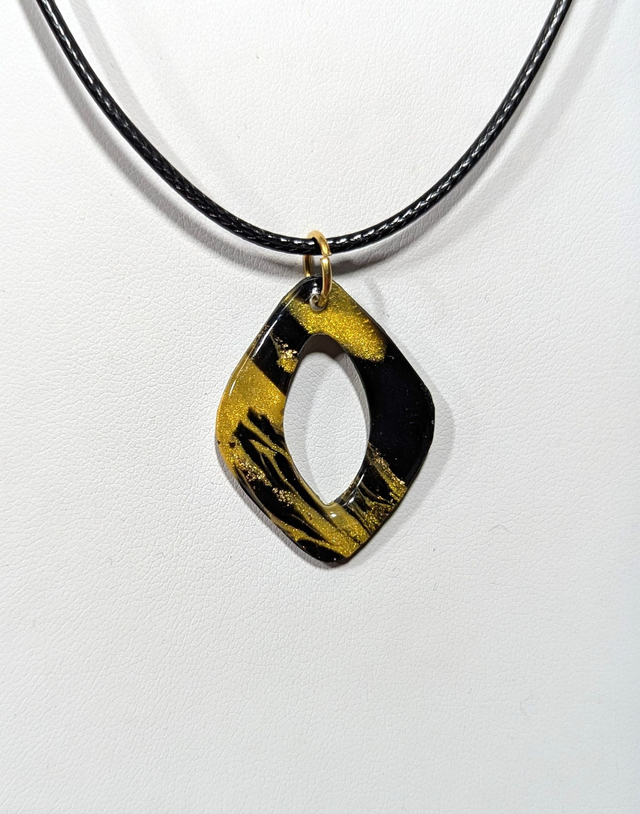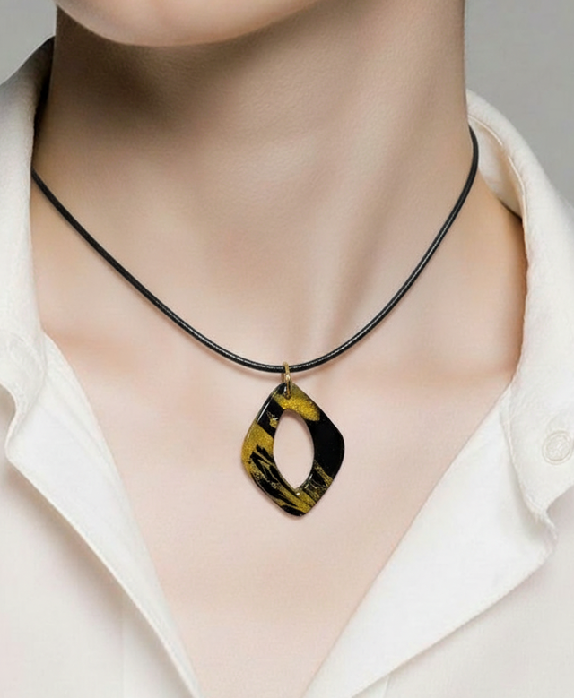 Mélange délicat de noir et doré avec une fine couche de touche de feuille d'or; le tout protégé par une couche de résine qui apporte éclat et profondeur. Il est monté sur un cordon mais possibilité de demander une chaine et de préciser la longueur de chaine souhaitée.